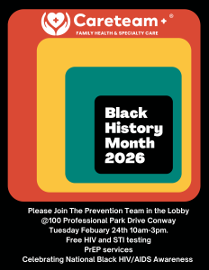 Please join the Careteam Plus Prevention team in the Lobby at 100 Professional Park Drive in Conway on Tuesday, February 24th, from 10am-3pm. There will be Free HIV, STI Testing, and PrEP services as we celebrate National Black HIV/AIDS Awareness. The fraternity, Phi Beta Sigma, will be in attendance.