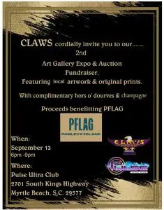 CLAWS cordially invite you to their 2nd Art Gallery Expo & Auction Fundraiser featuring local artwork and original prints. The event will have complimentary hors o’dourves & champagne. Proceeds will benefit PFLAG.
