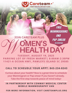 Curious about your health? Join Careteam Plus for Women’s Health Day on Tuesday, August 19th, from 8:00am-2:30pm at the Parking Lot of Fresh Market in Pawleys Island. Women get a FREE Mammogram and FREE Pap Smear screening! Call to schedule your appointment today at 843-2348243.